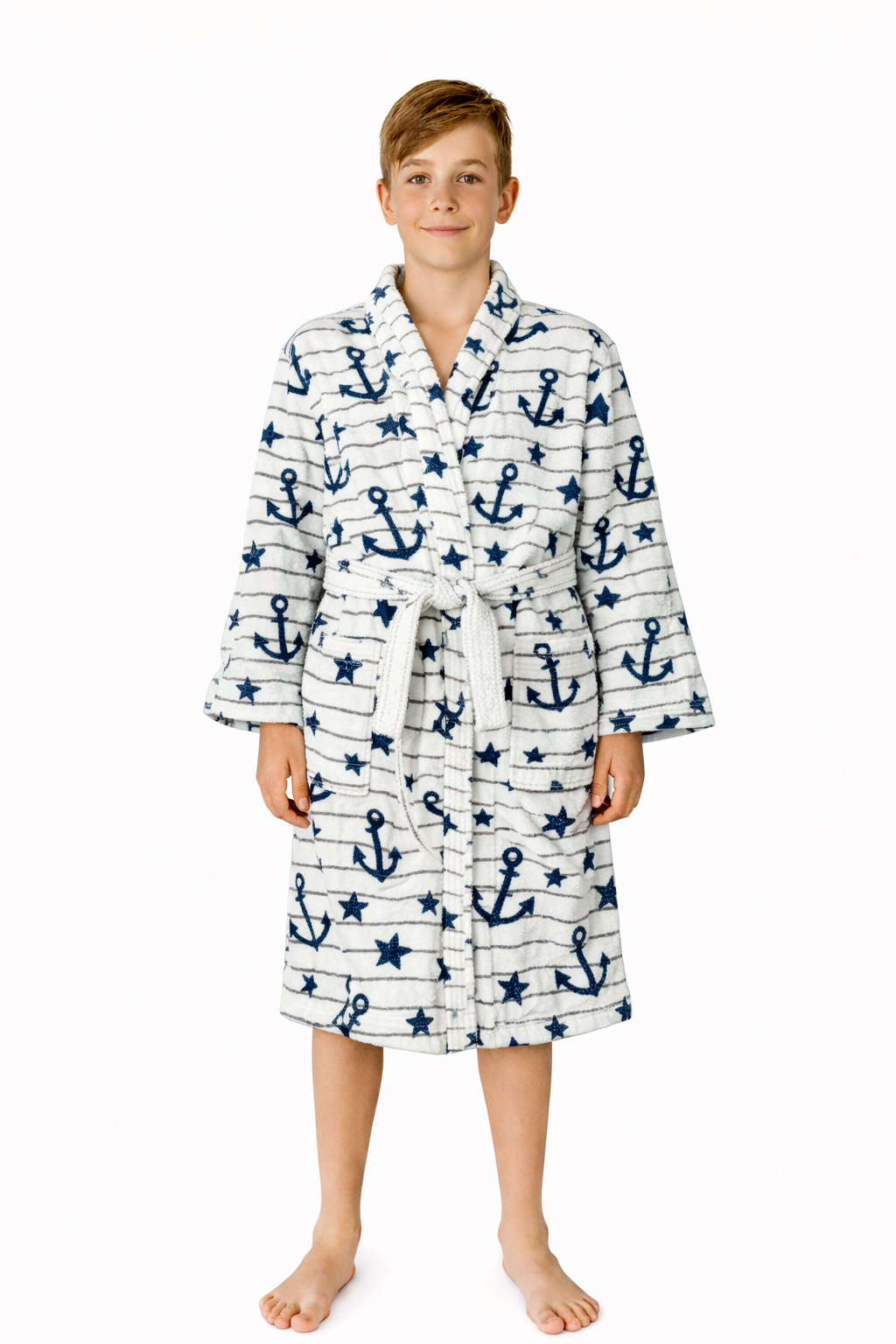 Bata infantil/juvenil 100% algodón, suave y cómoda para uso diario. Cuenta con listón ajustable para un mejor ajuste y corte práctico. Ideal para después del baño o para estar en casa con total comodidad. Diseño según modelo, tal como se muestra en las imágenes.