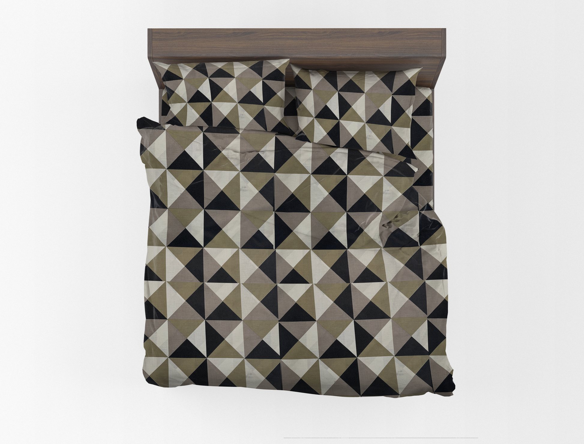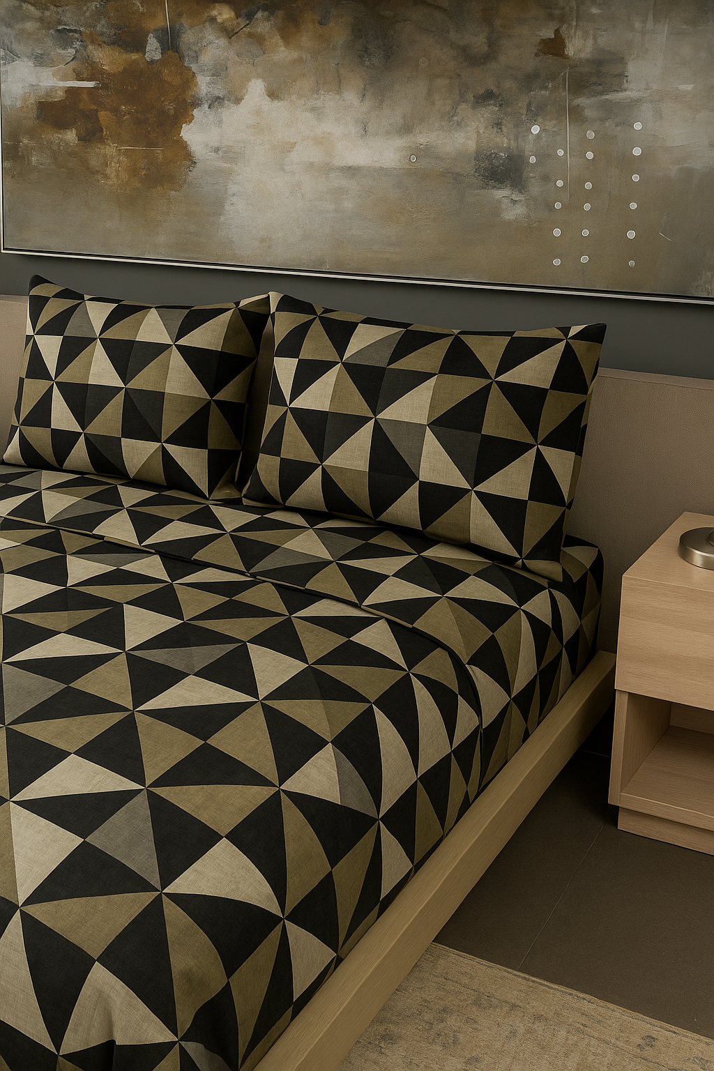 Renueva tu habitación con este moderno juego de sábanas de diseño geométrico en tonos negro, beige y gris. Su patrón de triángulos crea un efecto visual único que aporta estilo, elegancia y personalidad a cualquier espacio.