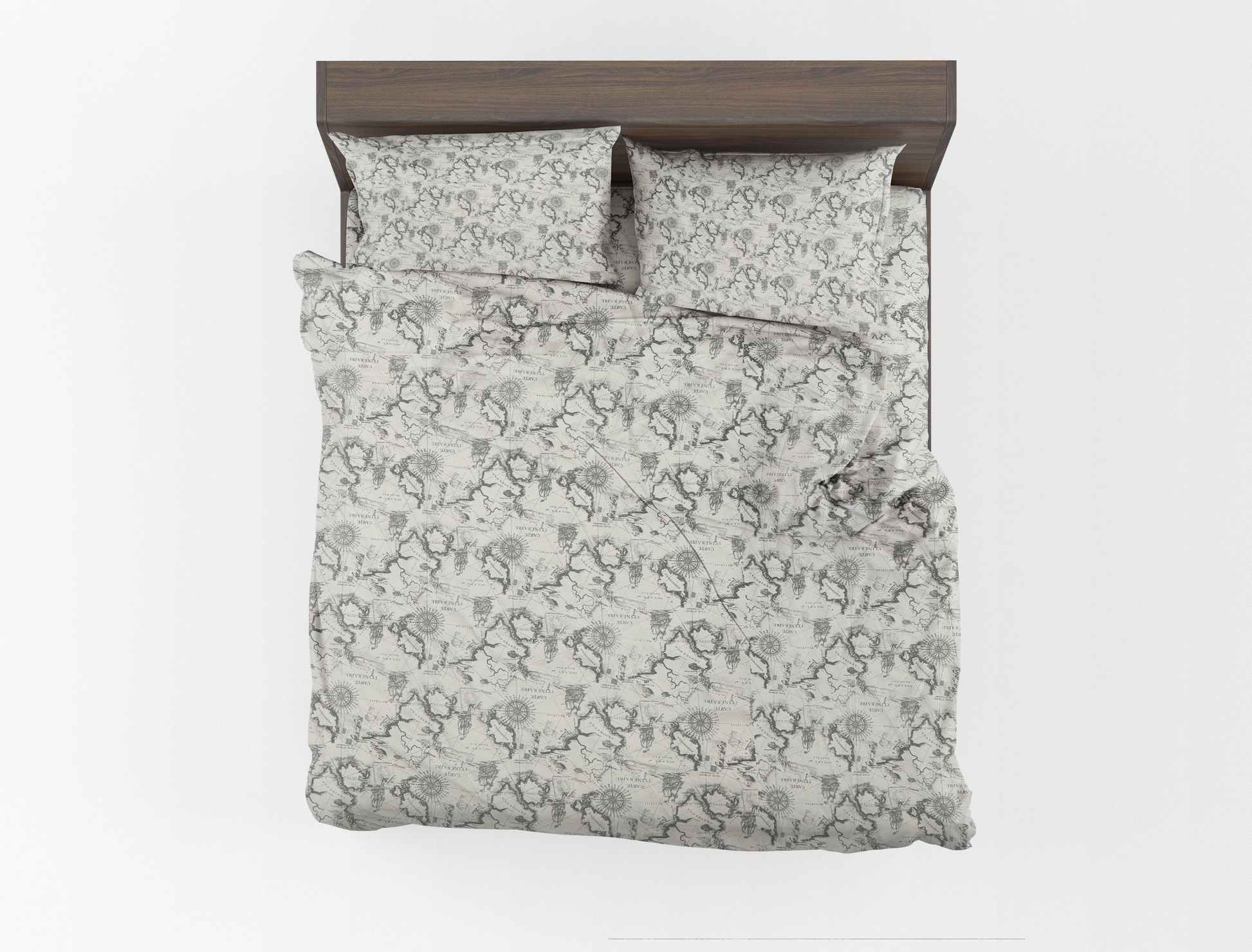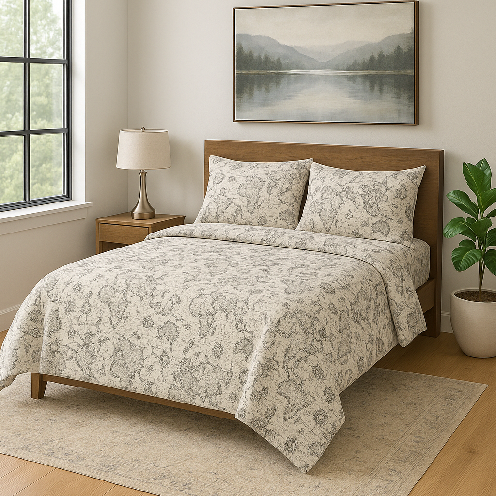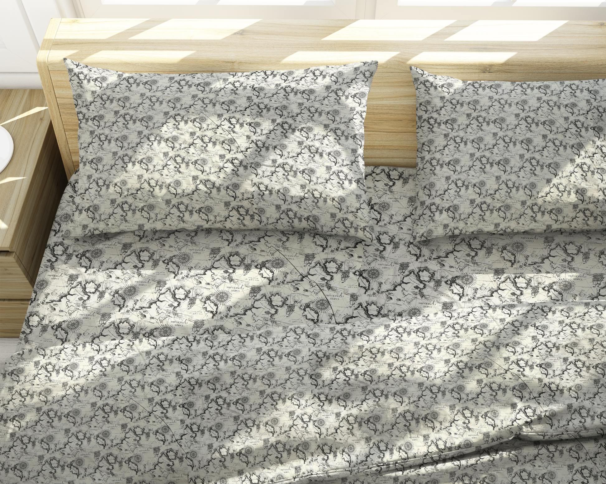 Agrega un toque único y sofisticado a tu recámara con este juego de sábanas con diseño de mapa antiguo, ideal para los amantes del estilo vintage y la originalidad. Confeccionado con una mezcla de 50% algodón y 50% poliéster, ofrece lo mejor de ambos mundos: suavidad, frescura y durabilidad.